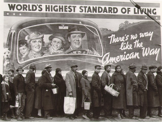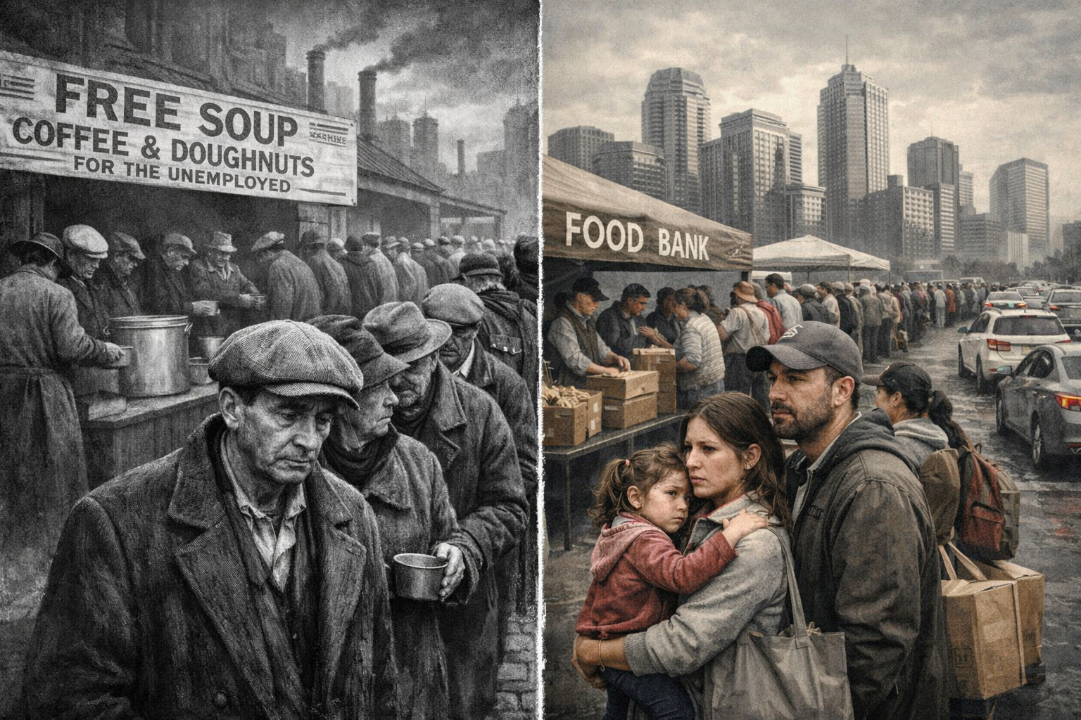 Nos anos 1930, durante a Grande Depressão, cerca de 25% da população americana enfrentou desemprego e insegurança alimentar. Filas por comida tornaram-se comuns. Aquilo foi reconhecido como uma falência sistêmica, levando a reformas profundas.