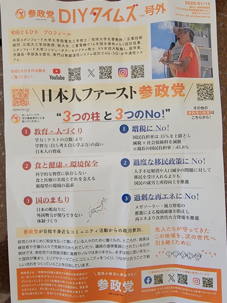 • Corte de Gastos com “Interesses Estrangeiros”: No panfleto que você enviou, há uma forte ênfase em “proteção do país” e “não às renováveis”. Eles sugerem que bilhões de ienes são desperdiçados em subsídios para empresas estrangeiras de energia verde e em auxílios externos, e que esse dinheiro deveria ser redirecionado.